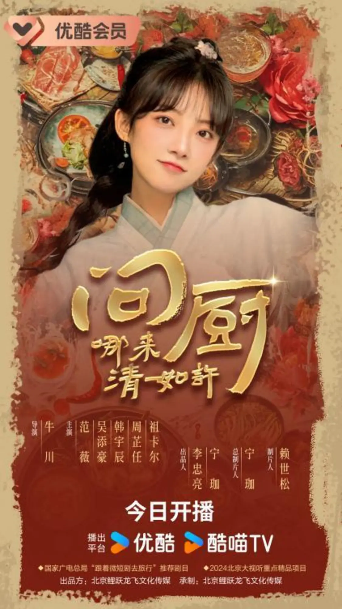 10月29日上午10点,古装美食爱情喜剧《问厨哪来清如许》上线优酷平台,每集10分钟共20集。该剧由北京鲤跃龙飞文化传媒有限公司出品,出品人李忠亮、宁珈,总制片人宁珈,制片人赖世松,导演牛川,由范薇、吴添豪、韩宇辰、周芷任、祖卡尔等新生代演员领衔主演。