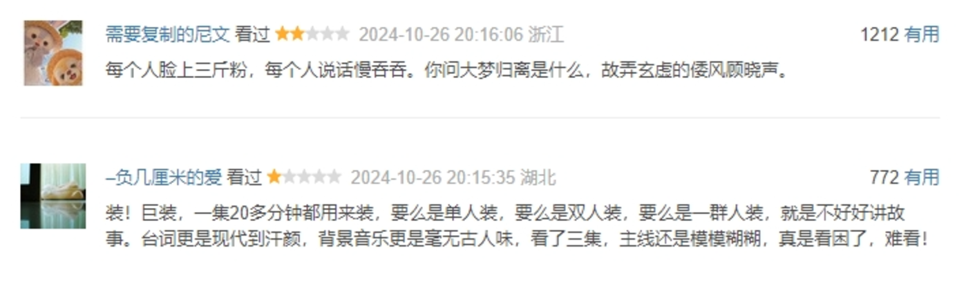 同样的问题也出现在新开播的网剧《大梦归离》上,豆瓣短评中点赞最高的两条均在吐槽“剧情的拖沓与不知所云”。