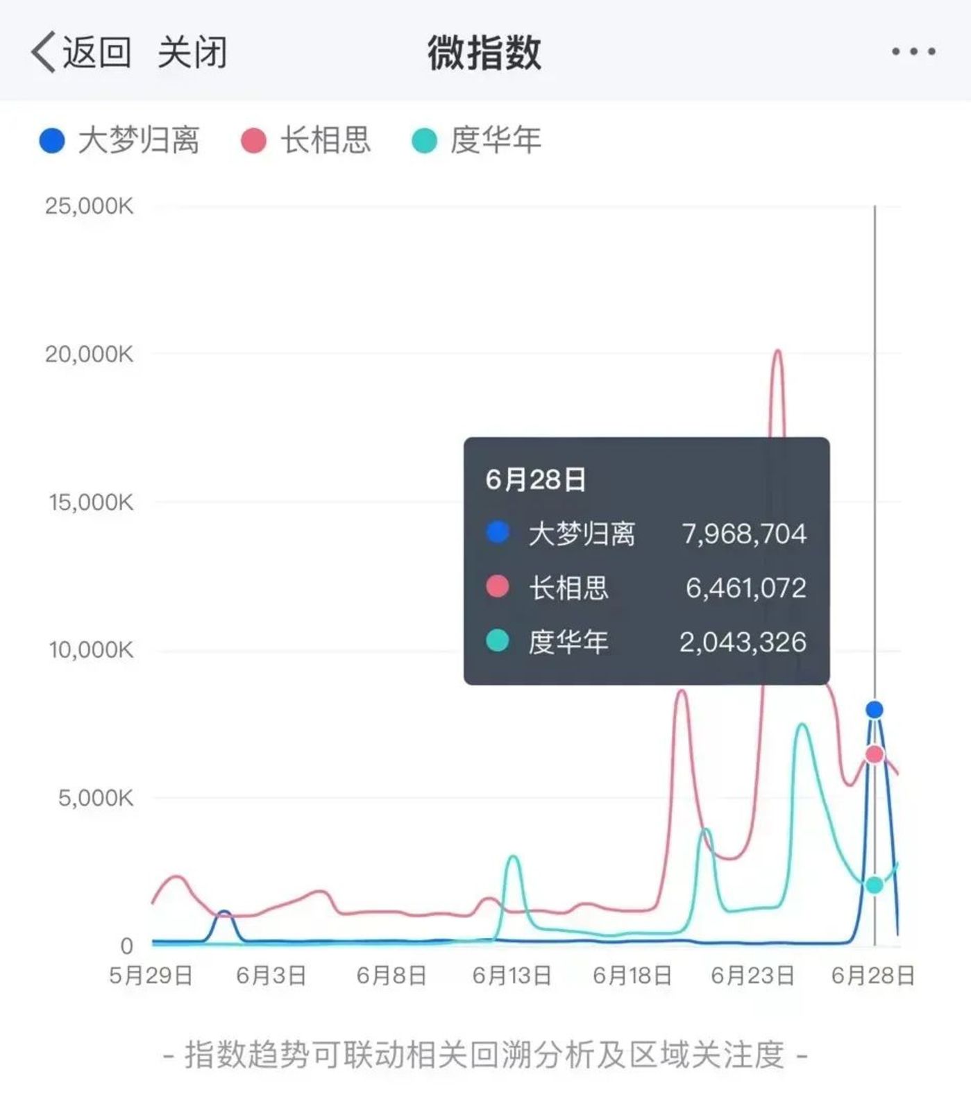 根据片尾曲上映当天6月28日的电视剧热度指数,该剧自早8点起便跃居首位,并持续霸榜近10小时,其热度值高达140万 ,远超《长相思》、《墨雨云间》等多部热播及待播古装剧,展现出断层式的领先优势。