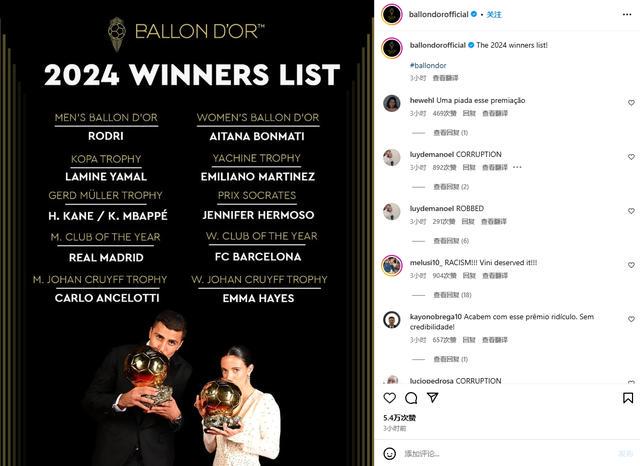 在金球奖官方ins发布维尼修斯排在第二后,社媒被冲,高赞评论都在谩骂。