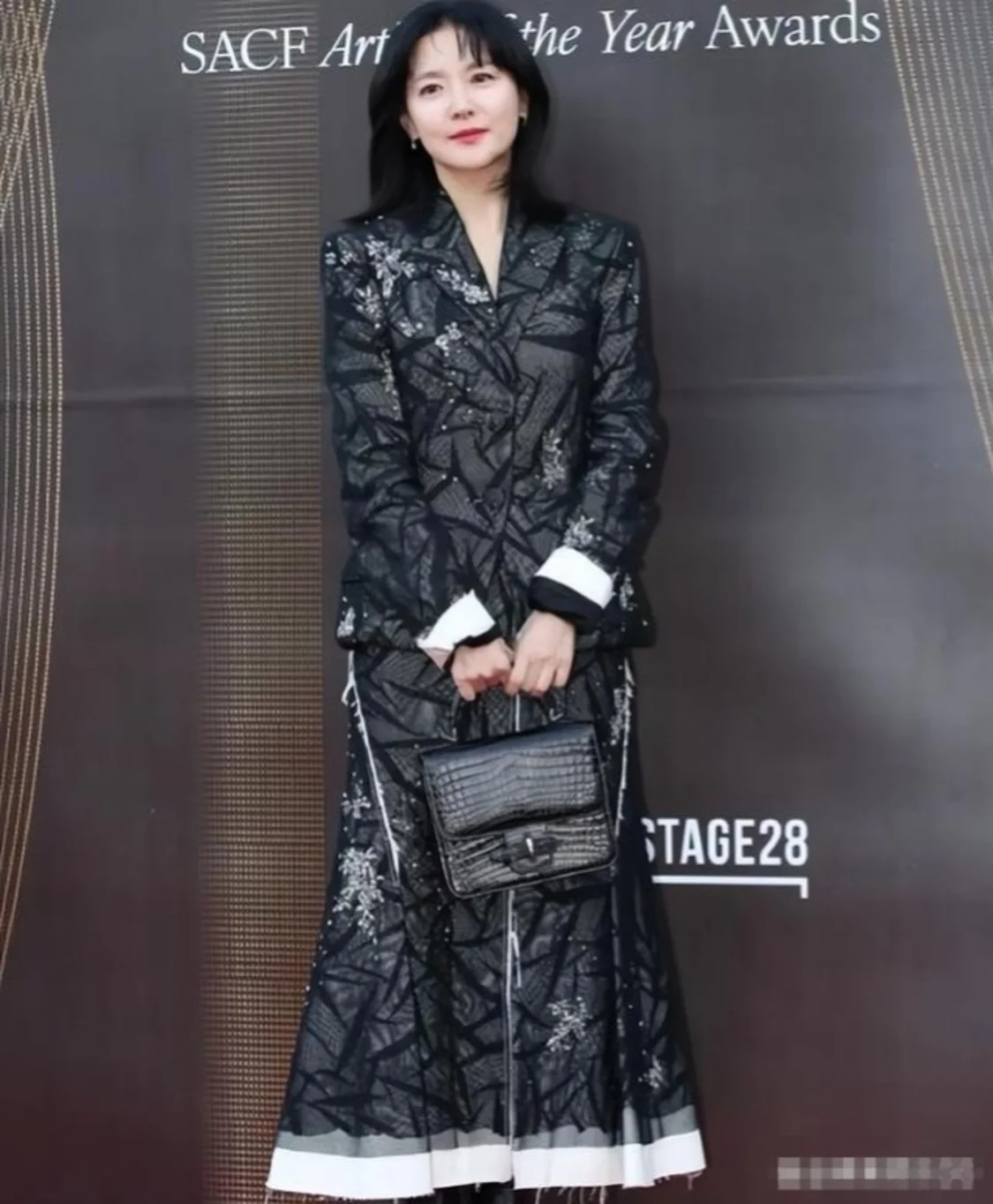 时尚套裙搭配一个黑色的包包,网友评论她仍旧属于韩国第一代青春女神,女神永远不老。