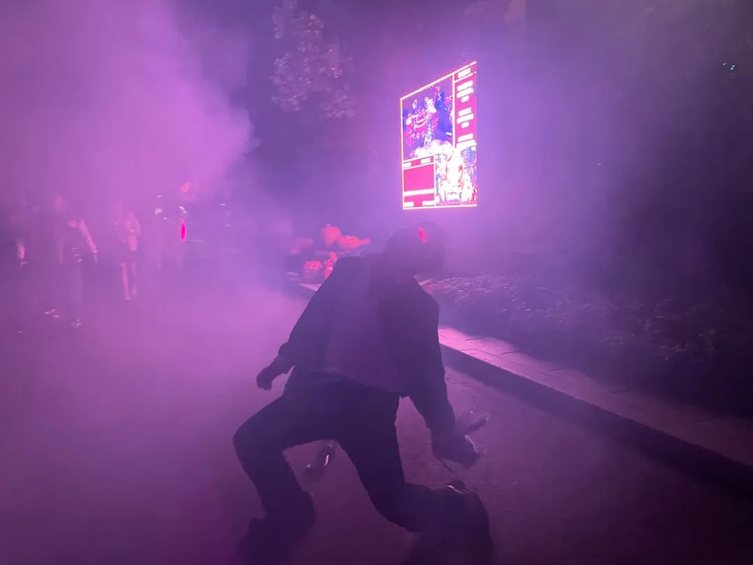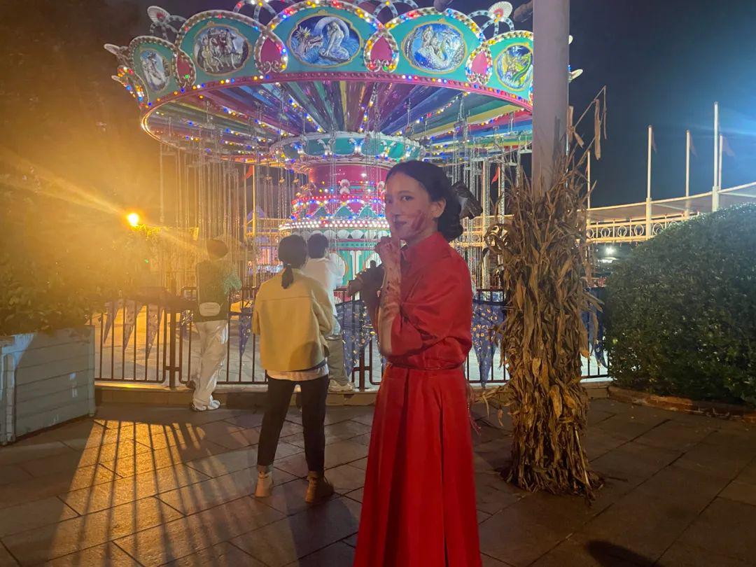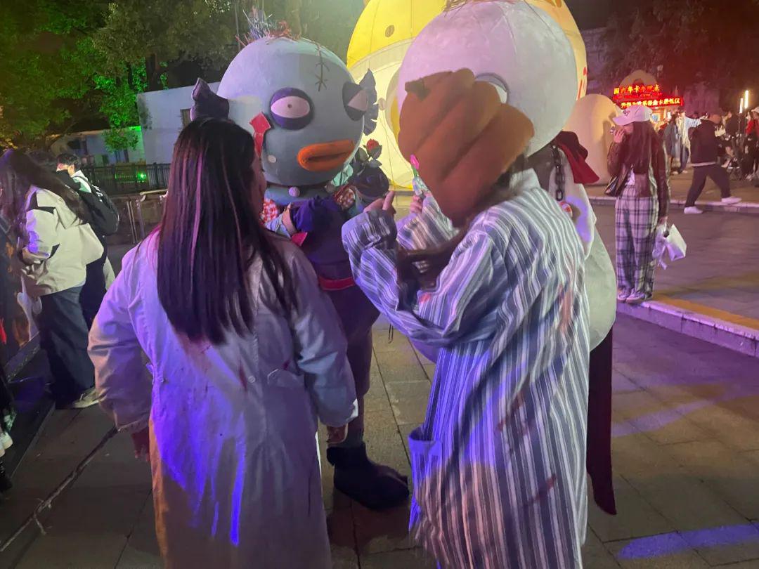 “扮鬼”是万圣节的保留节目,恐怖电影的角色往往很受欢迎。跟随空气中一阵甜腻的味道往前走,我遇到一位身着红裙的女士,她cos的是恐怖电影《珀尔》的角色。为了还原出“血迹”,她特地买了一盒红色糖浆,往手臂上、脸上一顿涂抹。糖浆有些黏腻,她几乎一整晚都晾着双手,生怕碰到别人。