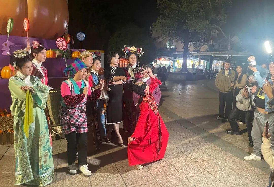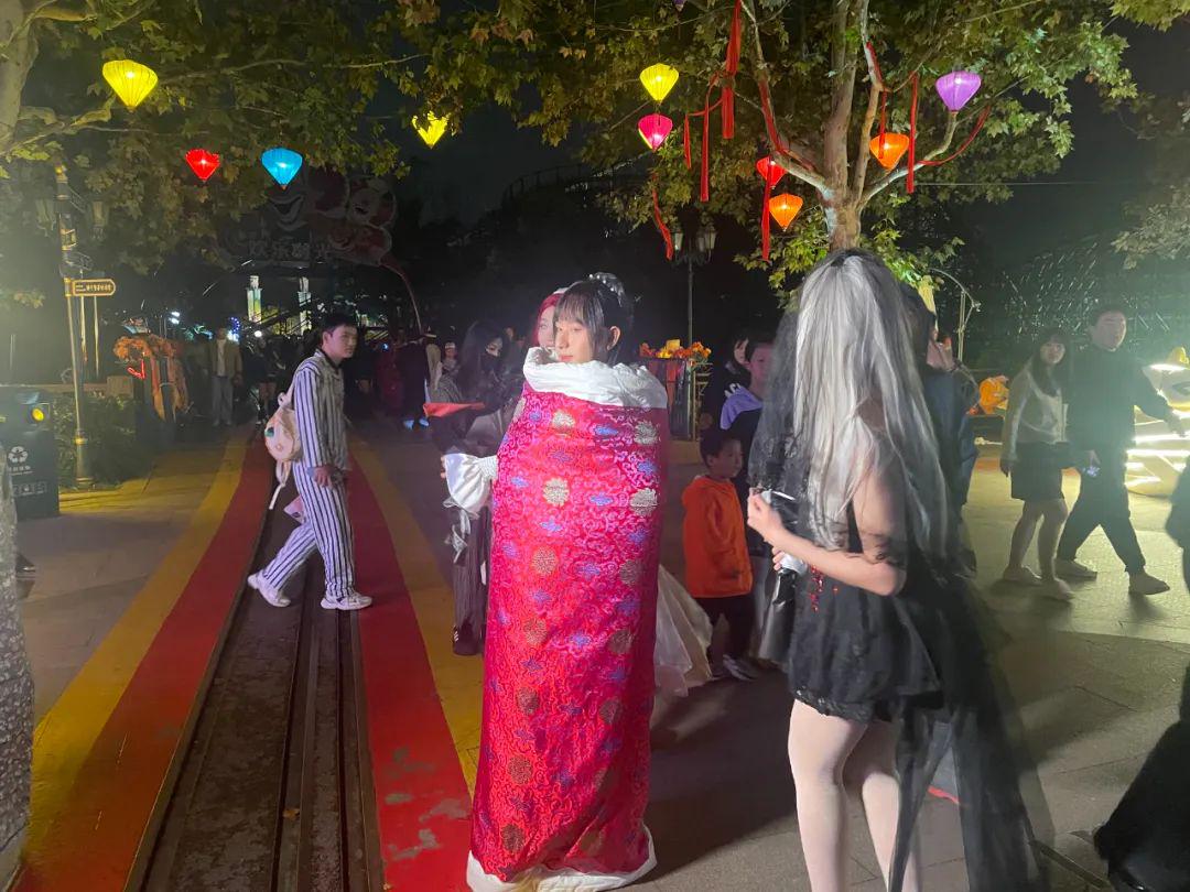 在欢乐谷过万圣节,很多NPC(工作人员扮演的固定角色)也会打扮成“鬼”,但不难区分出他们和游客。NPC的装扮比较精致,从服装到妆造,还原度很高;而游客出cos,大多戴个简陋面具,主打一个山寨本色,搞笑的意思到了就行。