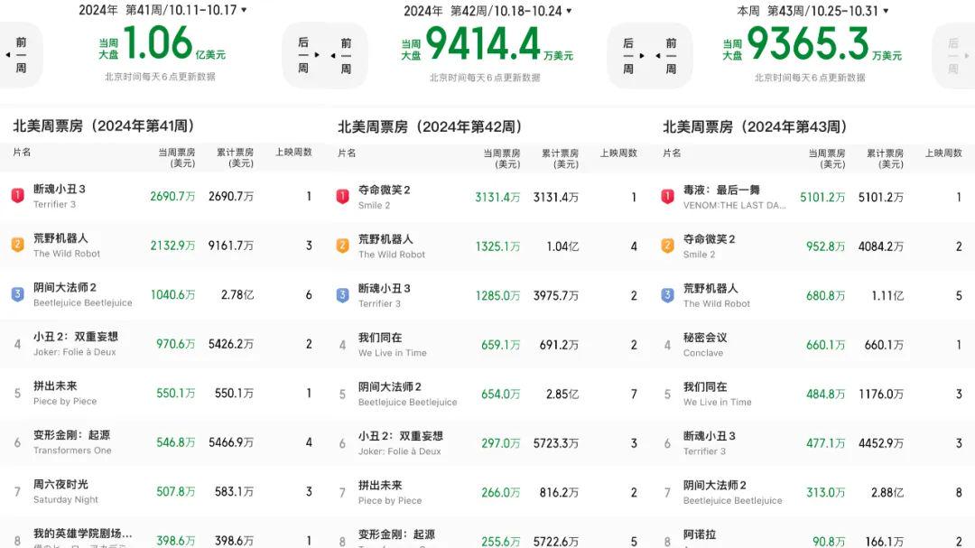 在老片方面,前周冠军《夺命微笑2》下跌近六成,双周累计刚超过4千万线,恐无力追赶前作破亿的成绩。由独立发行商Cineverse操盘的《断魂小丑3》公映三周后降至477万美元,而A24新作《我们同在》则拓展至2968家影院,以485万美元的预估票房反超至榜单前五名。最后,《小丑2:双重妄想》和《变形金刚:起源》仍未突破6千万美元,成为秋季档两大失望之作,与《怪奇大法师》和《荒野机器人》形成鲜明对比。