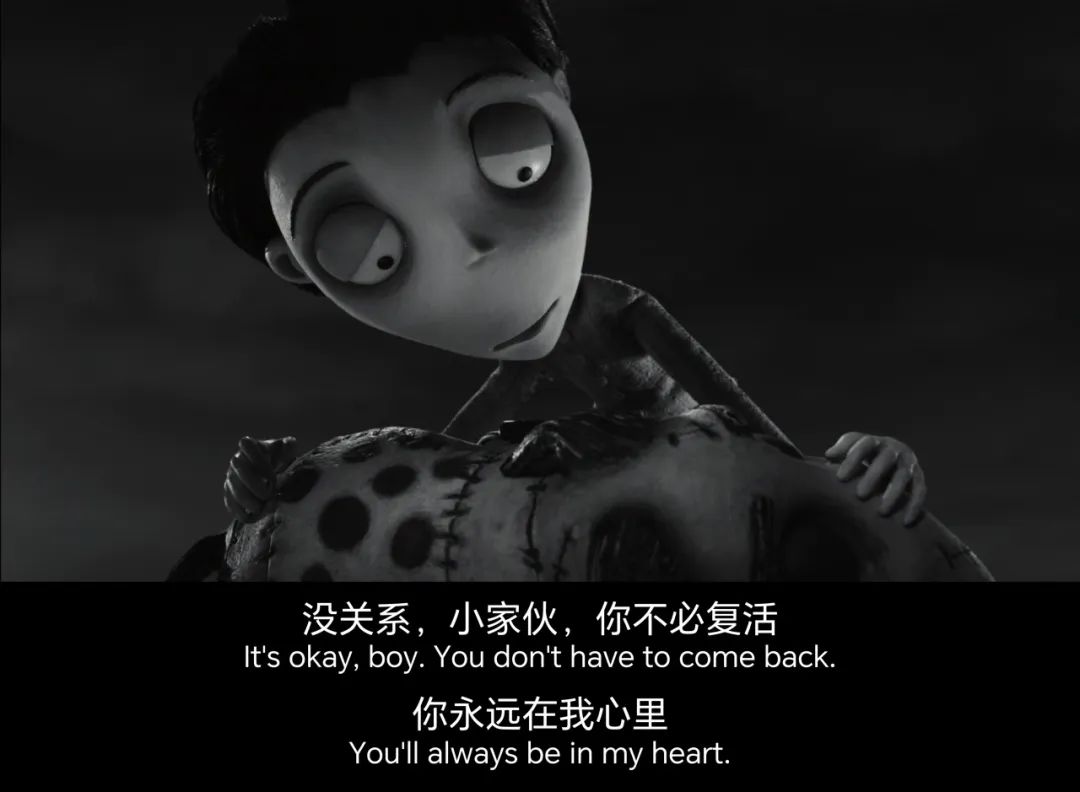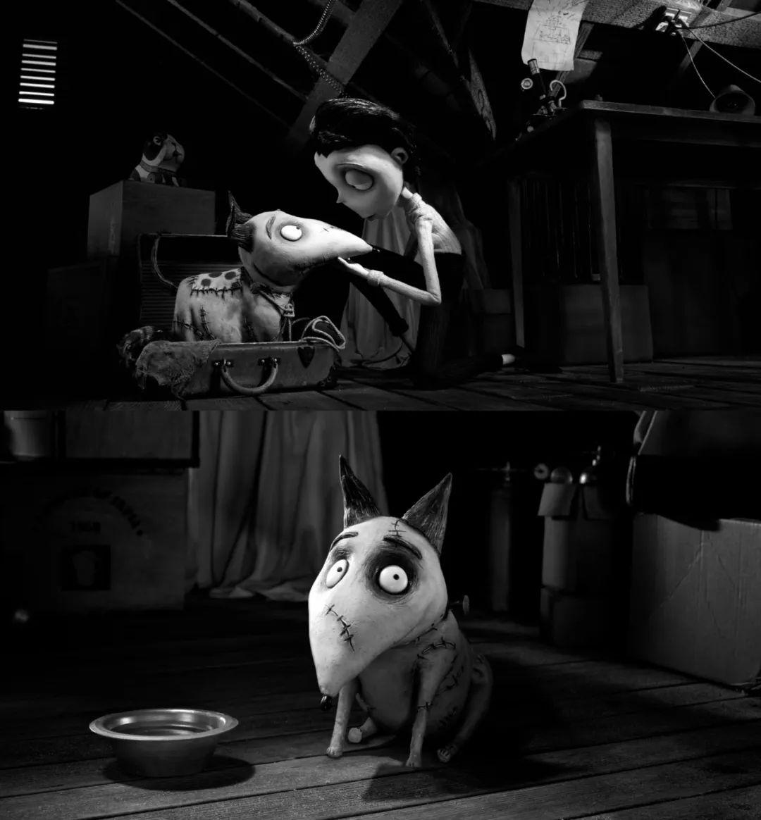这部动画致敬了许多恐怖片,画风诡异,人物造型是经典的“波顿风”尖脸大眼睛,小狗Sparky更是像弗兰肯斯坦一样满身缝线,吓人又可爱。