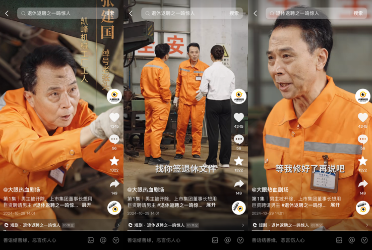《退休返聘之一鸣惊人》在"大眼热血剧场"等剧场号上线后,截至10月31日早上9点半,累计播放量已超过1300万次,且仍处于增长中。
