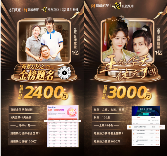 在半年多的时间里,时刻互动推出了40部短剧(包含全闭环自制剧与承制剧),其中自制剧《高考万岁之金榜题名》(闭环自制剧)、《王妃你今天休夫了吗》(番茄承制剧)两部短剧充值破2000万,多部短剧跻身DataEye短剧热力榜和红果短剧排行榜。