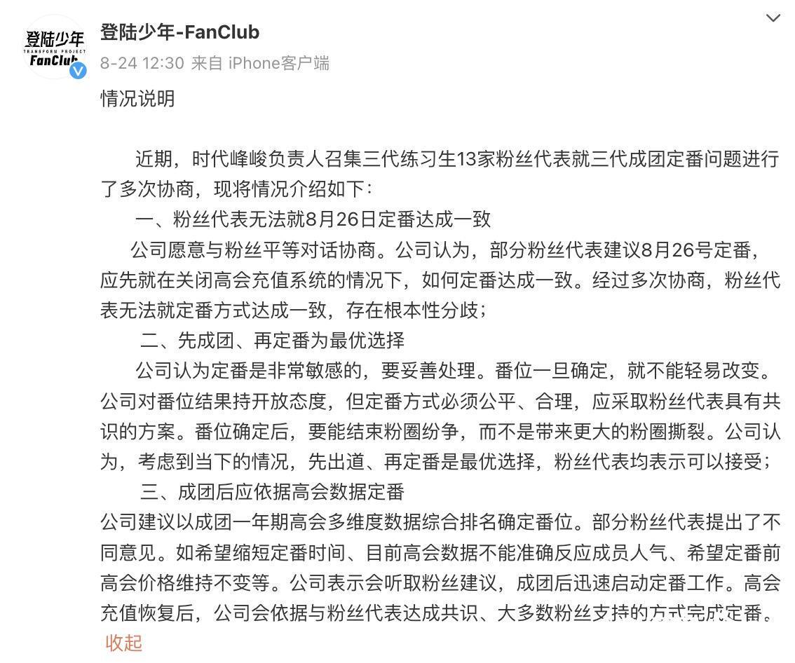 更严重的反噬是,练习生接连出现的负面争议,使公司的养成系根基遭受重创。创始人李飞接受娱理工作室采访时曾直言:“可能是三代赶上了时代峰峻最顺的时间点,练习生管理上相对一代、二代有所疏忽,暴露了一些问题,我们确实需要检讨。”今年8月26日,在马来西亚吉隆坡的“登陆时刻”演唱会上,时代峰峻宣布了三代组合登陆少年的出道人选,但仅两天之后,成员余宇涵就因负面争议退出,目前登陆少年以朱志鑫、张泽禹、张极、左航和苏新皓五人形式活动。