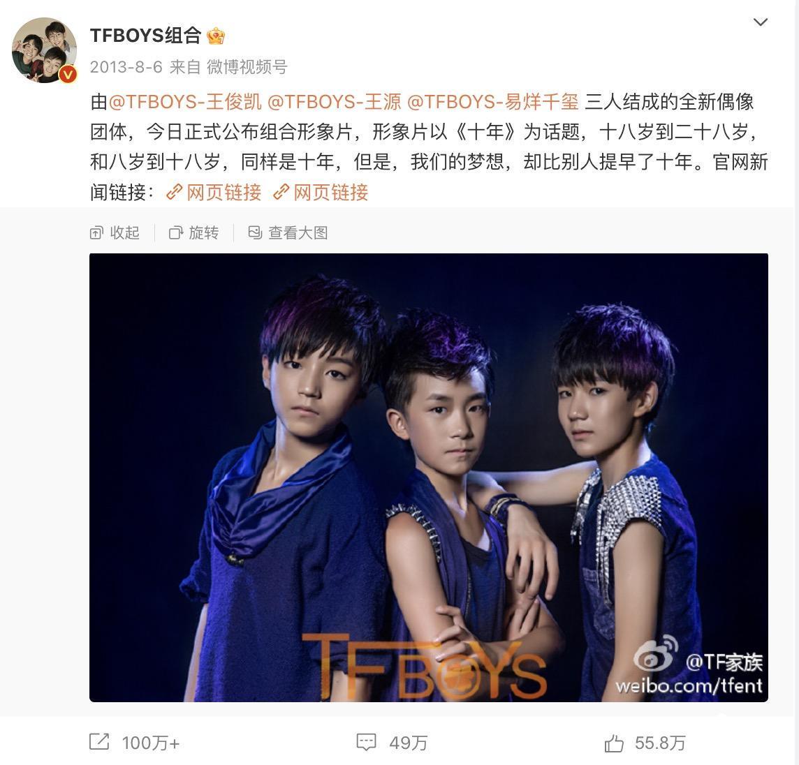 2013年,前飞炫少年组合成员易烊千玺加入公司,同年8月6日,TFBOYS组合正式宣布出道,与粉丝定下“十年之约”。