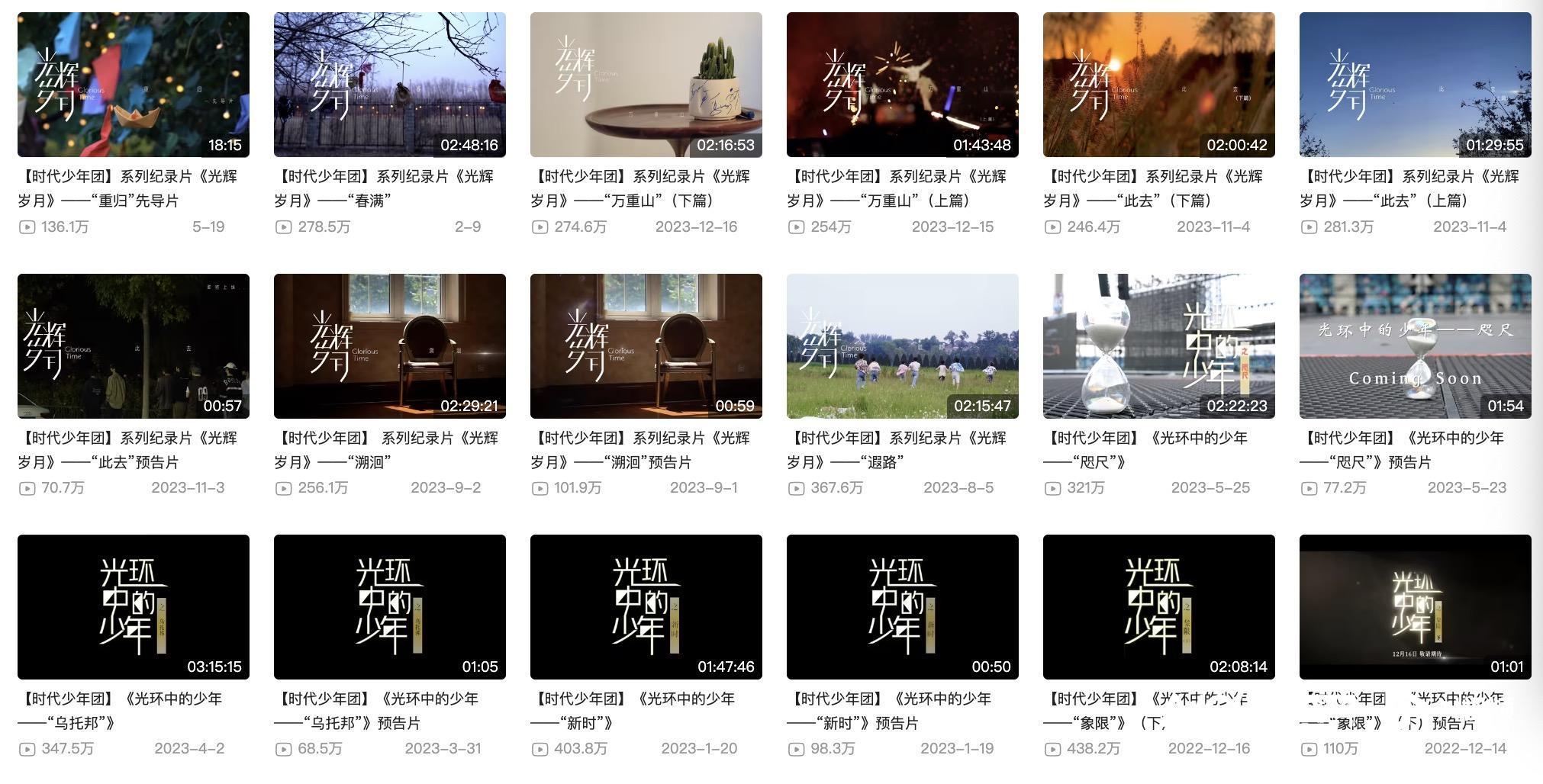 时代少年团出道后,时代峰峻也拍摄了许多游戏综艺、舞台秀、纪录片、日常花絮、节日策划等不同类型的自制内容,光是纪录片就有《光环下的少年》《光环中的少年》和《光辉岁月》三个系列。在时代少年团官方B站账号的963个投稿视频中,播放量破500万的视频有82个。