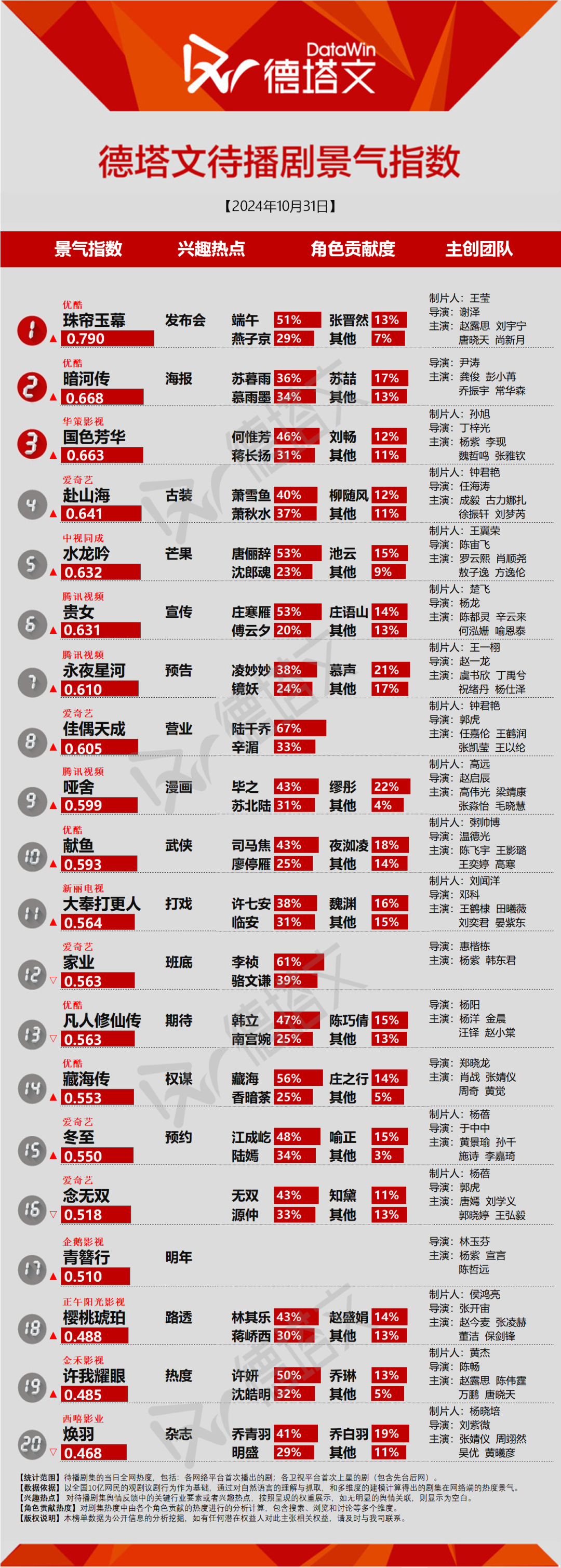1、德塔文剧集景气指数计算剧集的全网讨论度、网友互动量、媒体曝光率,网络口碑等要素,致力于反映最真实的剧集热度,是行业更先进的剧集热度指标;