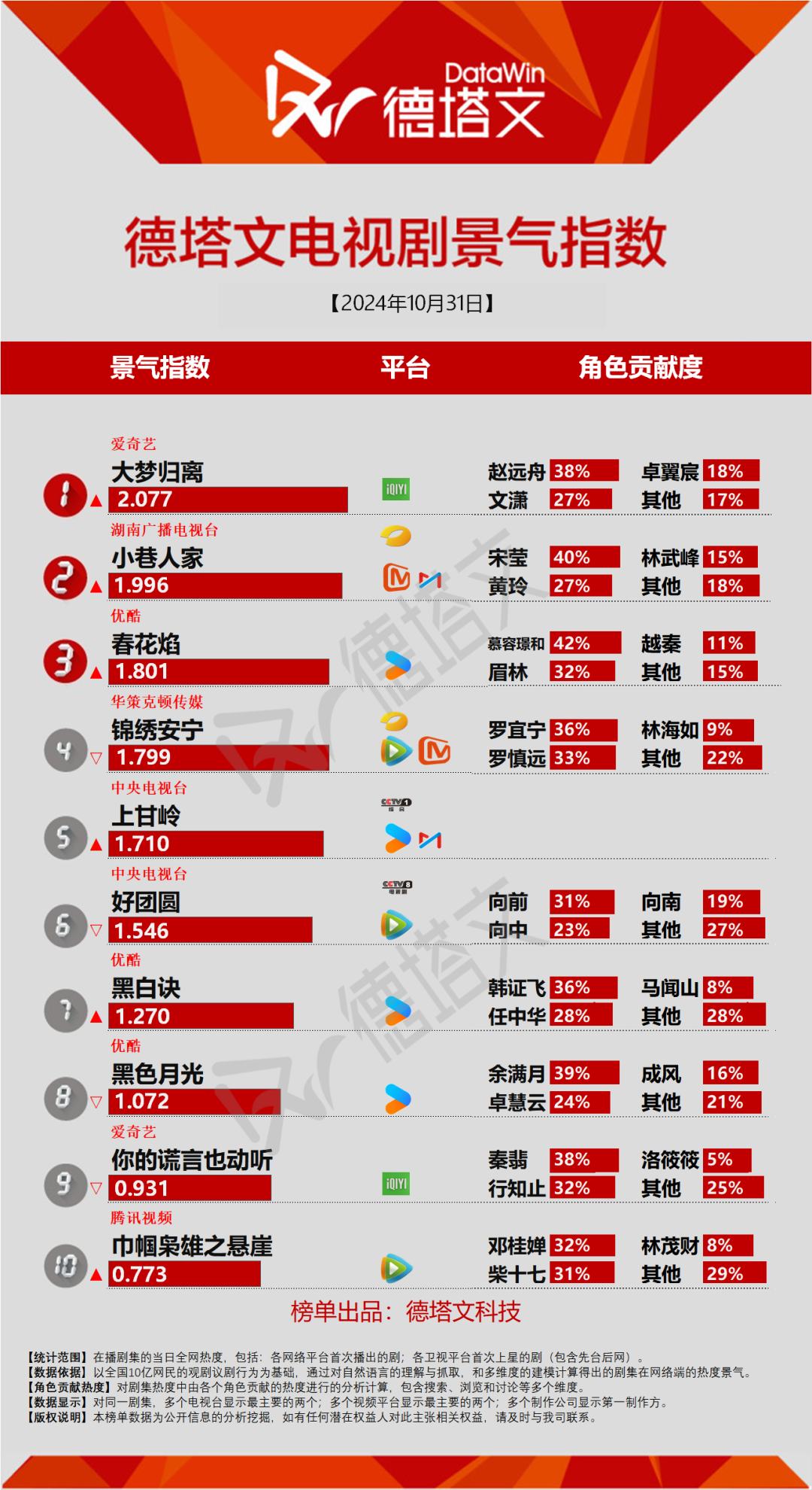 《大梦归离》连续稳坐头部市场,《小巷人家》走势稳健。