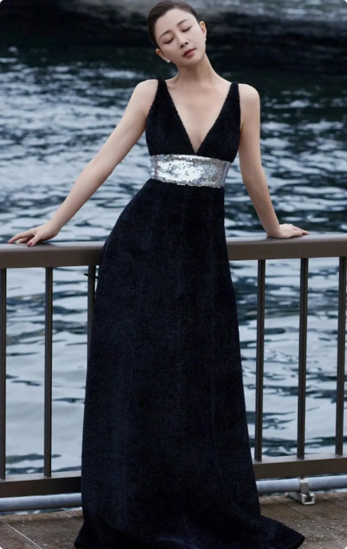 她一身黑色的修身礼裙,腰间搭配着银色的掐腰设计,夸张的腿长比例,在这一身礼裙的衬托下堪比超模。