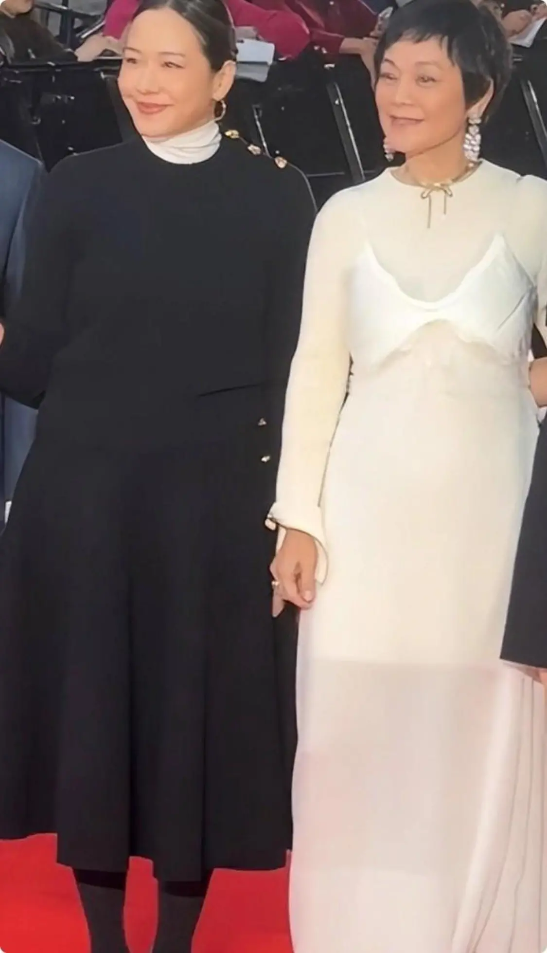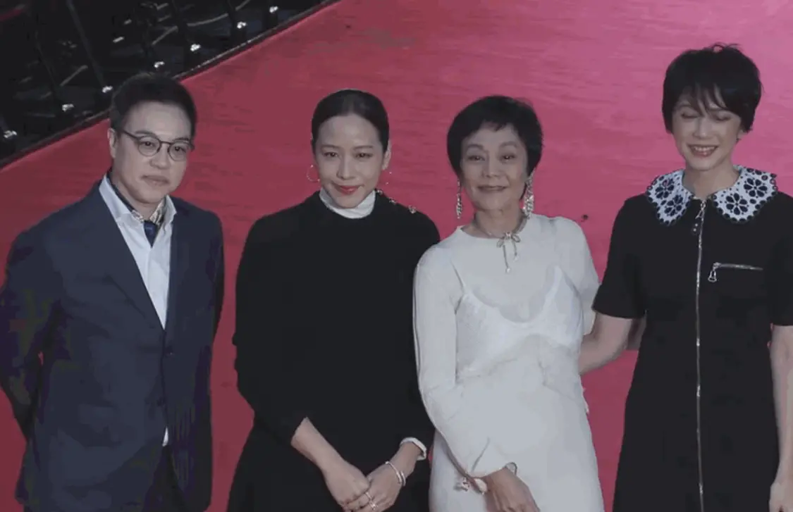 许久未见的张艾嘉,一袭白色长裙,裙子的质感虽然略显廉价,但是张艾嘉的状态还算不错,黑色短发干练简单,夸张的耳饰富婆感十足,关键是在一旁林嘉欣的对比下,她的身材保持得是真不错。