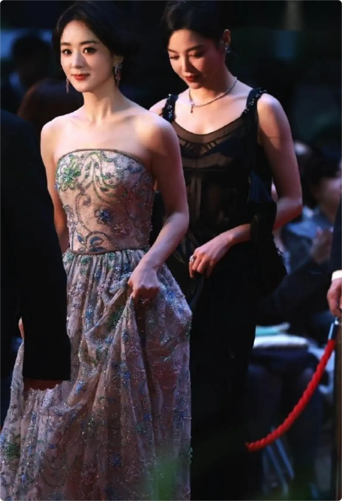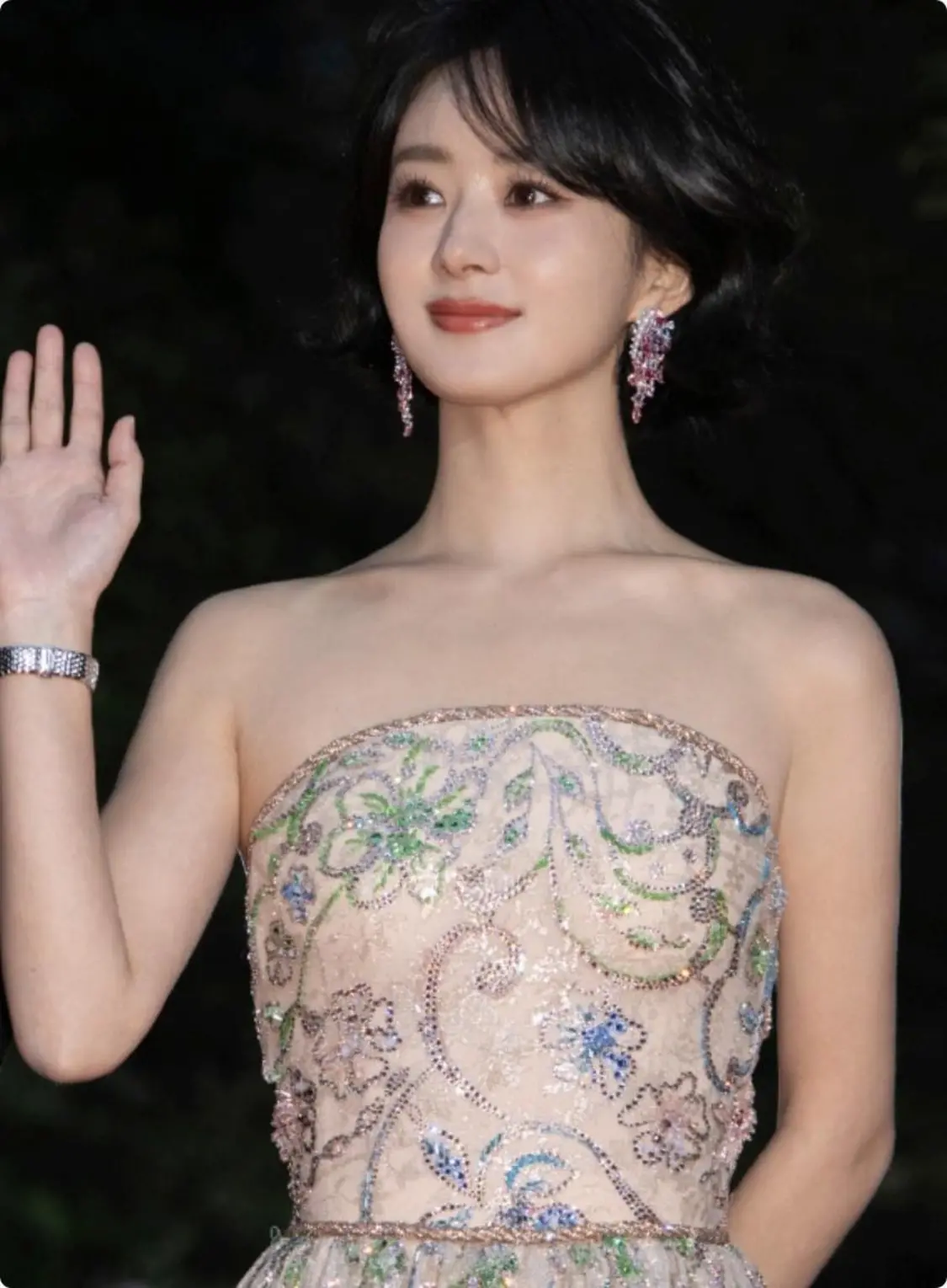 这身刺绣抹胸裙,颜色典雅,但奢华张扬,穿在赵丽颖的身上既有公主千金的矜贵,又有女王的奢侈霸道。
