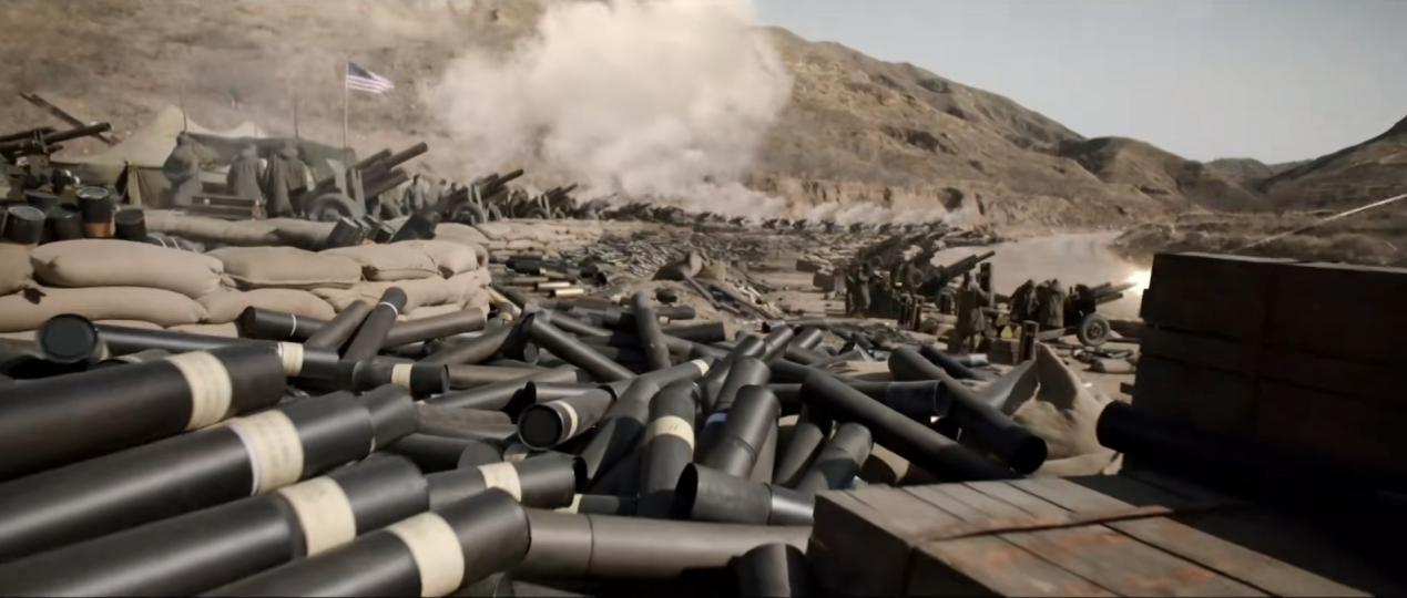 ■电视剧《上甘岭》中的美军炮兵阵地和堆积如山的弹药筒。