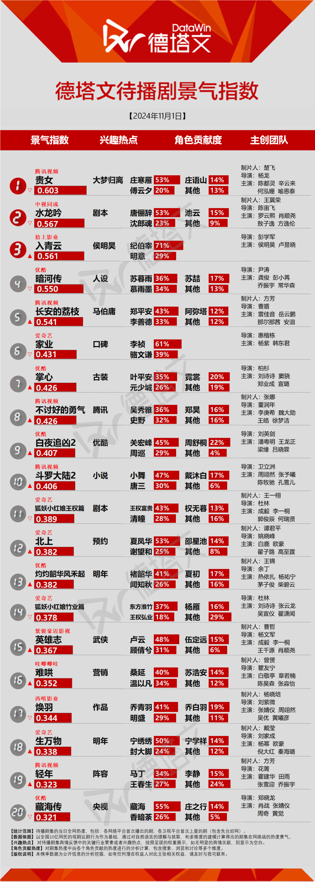 1、德塔文剧集景气指数计算剧集的全网讨论度、网友互动量、媒体曝光率,网络口碑等要素,致力于反映最真实的剧集热度,是行业更先进的剧集热度指标;