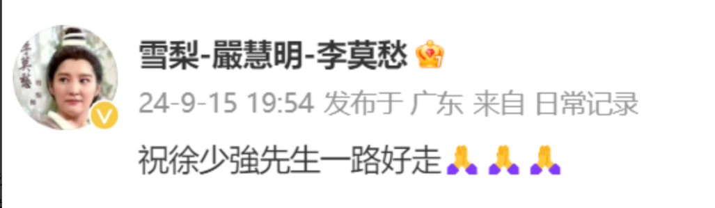 值得一提的是,在徐少强去世的消息刚被曝出时,雪梨就第一时间发布了悼念文字。
