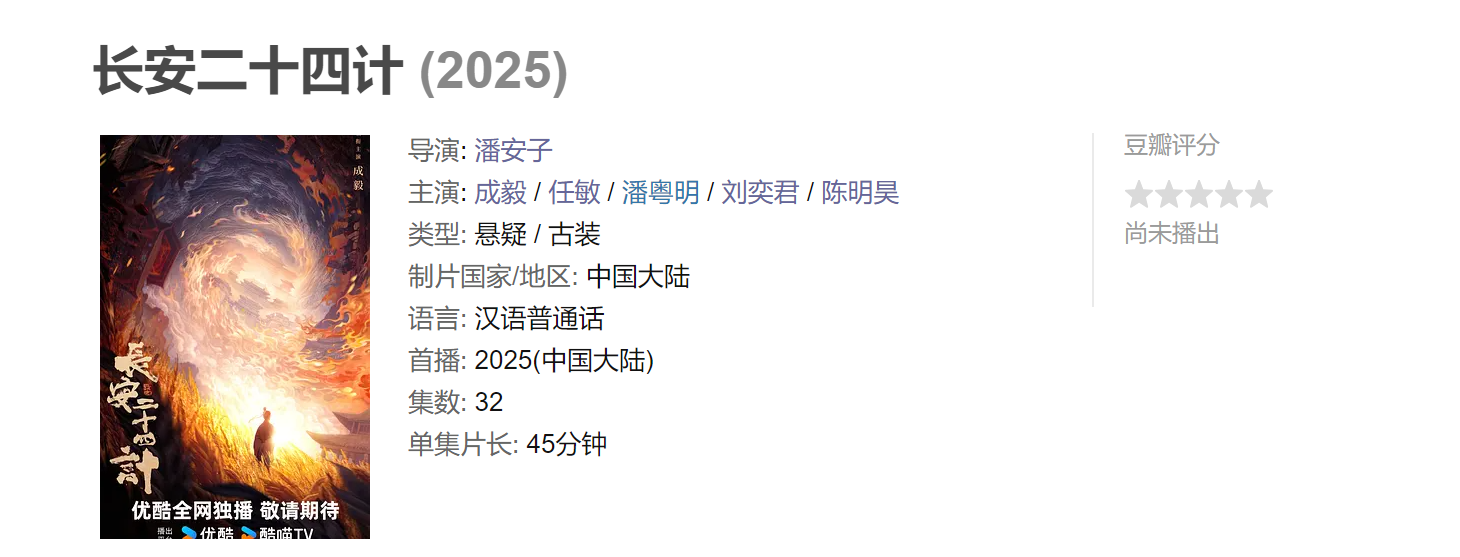 虽说非官不宣,但是在比较有分量的豆瓣网页,《长安二十四计》的主演阵容以及主创团队都已经给出了名单。
