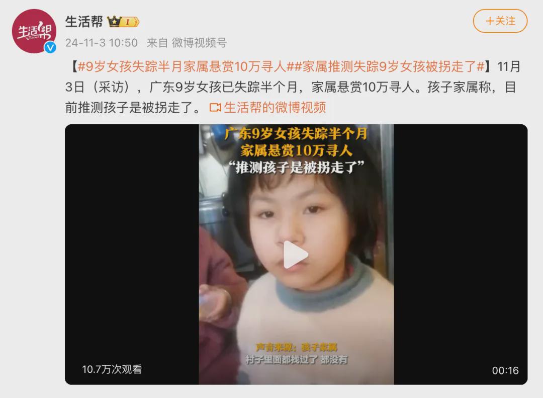 #9岁女孩失踪半月家属悬赏10万寻人#