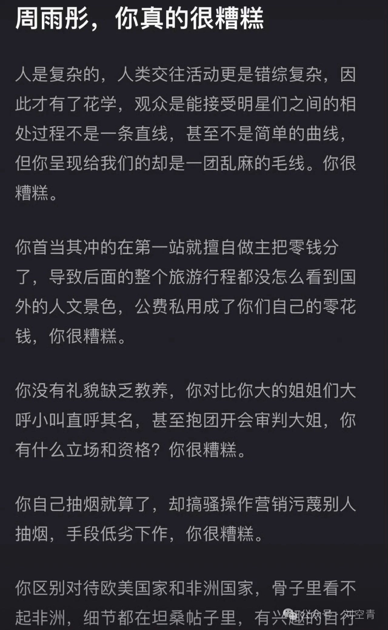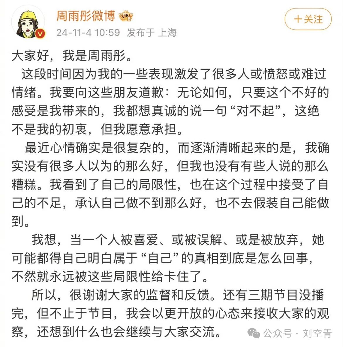 不过意外的是,四段话,居然都引发了各种吐槽。因为周雨彤的道歉,很拧巴,怎么看都感觉不是真正的道歉,而是在道歉下的一种不服气,不甘心。