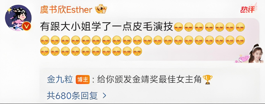 虞书欣看到后,在底下留言:希望金靖能够出山。