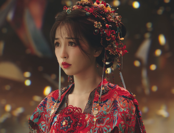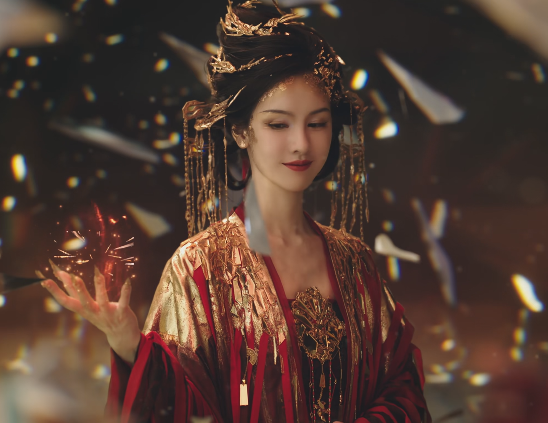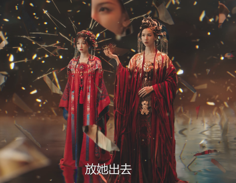 剧中的镜妖造型十分华丽,一头金钗和脸上的金箔与红袍上的金色呼应,不见半分从前的清冷感,脸上带着漫不经心的微笑,倒是有一种神秘又危险的气息。