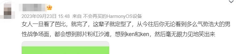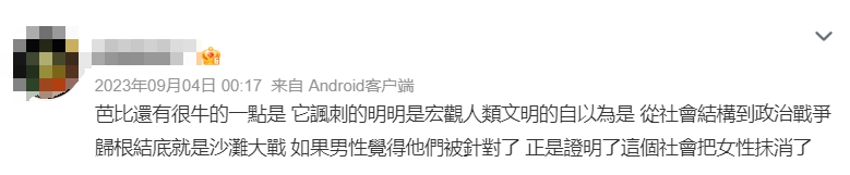 这一套理论源自欧美女权,你们可以回忆一下芭比是如何解构战争的“男性所谓的战争不过是沙滩上的过家家”哪有那么多战争?哪有那么多牺牲奉献,不都是你们男性闹着玩所以麻烦不要再提什么男性为国家的牺牲付出了。