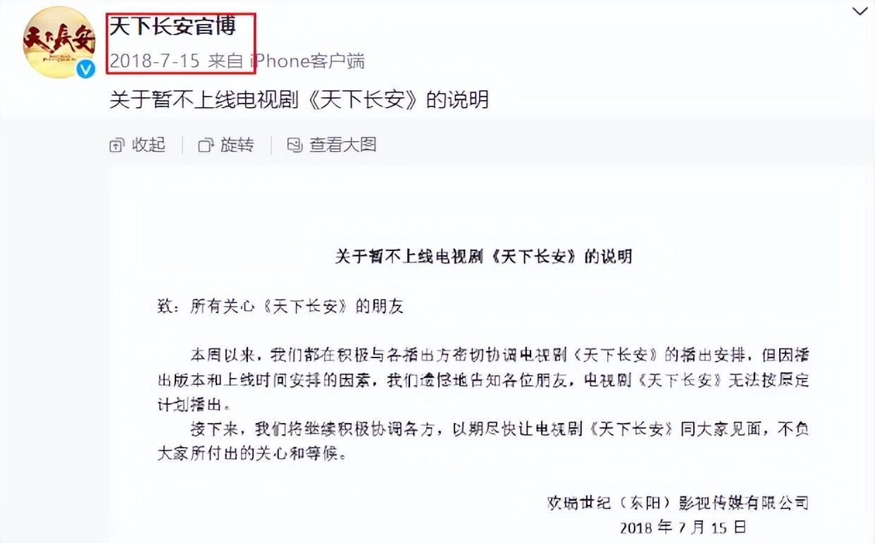 虽然欢瑞总裁赵枳程在2018年股东大会声称《天下长安》撤档并非由于剧情内容,而是由于技术原因,但是这个说法并未得到大家的认可。