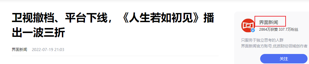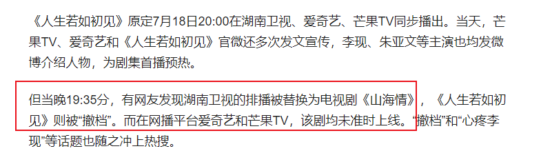 《人生若如初见》原定在2022年7月18日,由上星卫视和多个网络平台同步播出,剧方及李现、朱亚文等主演都已经发微博预热,然而它却在播出当晚被《山海情》替换。