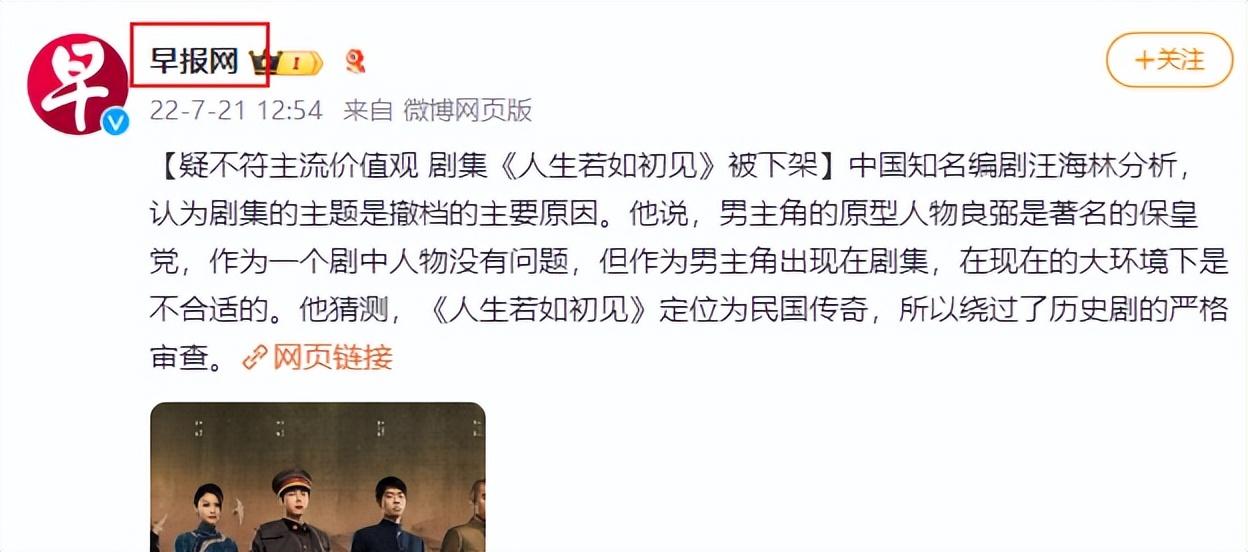 知名编剧汪海林分析,该剧撤档的主要原因是主题不符合当今主流价值观,在民国时期男主角的立场却处在了正常价值观的对立面,这显然是不合适的。