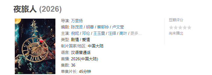 《夜旅人》由倪妮、邓伦主演,是一部男女主跨越时空相恋的奇幻故事。