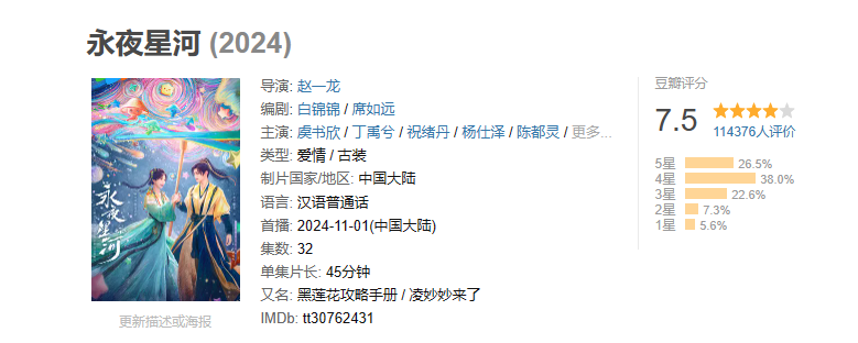截至目前,该剧在豆瓣11万人打分的情况下能有7.5分的评分,在这两年的古偶圈子都难得一见。