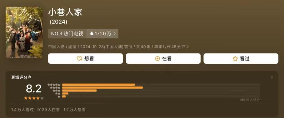 《小巷人家》果然是正午阳光最拿手的题材类型,目前剧情还未过半,就已经揽获了8.2的高评分,足见观众们对这部作品的认可度有多么高。
