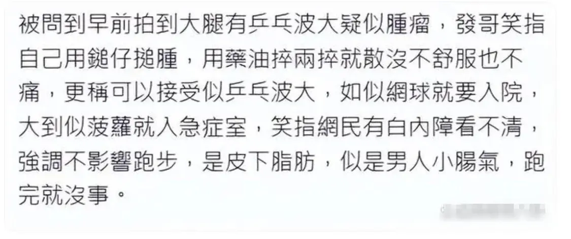 从照片中可以看到他手臂上有葡萄大小的肉球,这也是让网友们揣测他健康状况的原因之一。