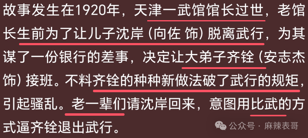 老爷子不想让自己儿子接手武馆,于是去世前让大弟子接手,大弟子接手后进行大改革,引起老辈们的不满。