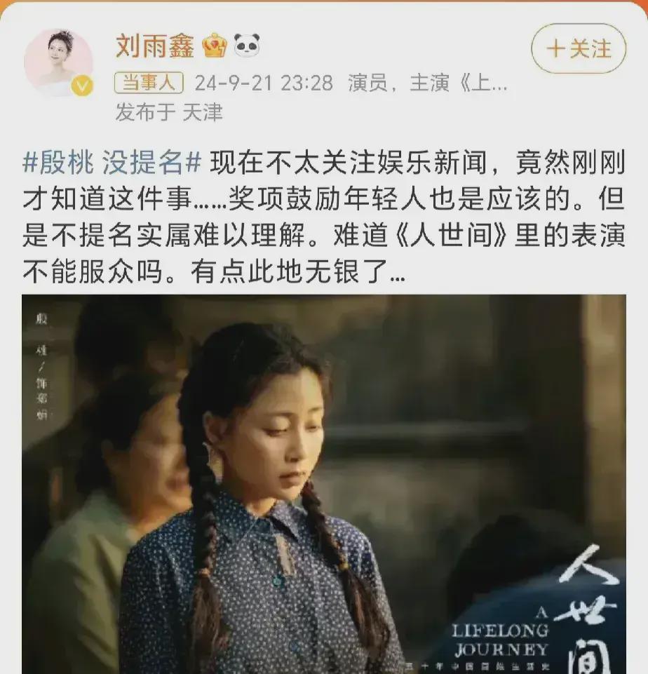 女星刘雨鑫更是公然贴脸开大,表示殷桃在《人世间》中的表演有目共睹,却连提名都没有,实在让她意难平。
