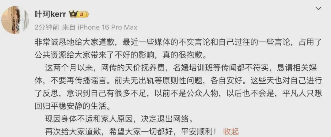 非常诚恳地给大家道歉,最近一些媒体的不实言论和自己过往的一些言论,占用了公共资源给大家带来了不好的影响,真的很抱歉。这两个月以来,网传的天价抚养费,名媛培训班等传闻都不符实,恳请相关媒体,不要再传播谣言。前夫无出轨等原则性问题,各自安好。这些天也对自己进行了反思,意识到自己有很多不足,以前不是公众人物,以后也不会是,平凡人只想回归平稳安静的生活。现因身体不适和家人原因,决定退出网络。再次给大家道歉,希望大家一切都好,平安顺利!