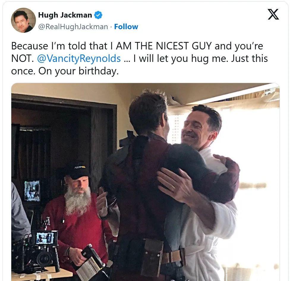 2018年,雷诺兹生日时,杰克曼就在推特上,发了一张两人拥抱的片场照片,配文是“因为有人说我是最善良的人,但你却不是哦!我会让你抱我一下,不过也就生日这天。”