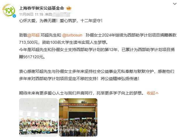 今年他们两口子用71万资助百名大学生,而这件事他们已经坚持了12年,捐赠总数超过950万,无疑是孩子们的榜样。