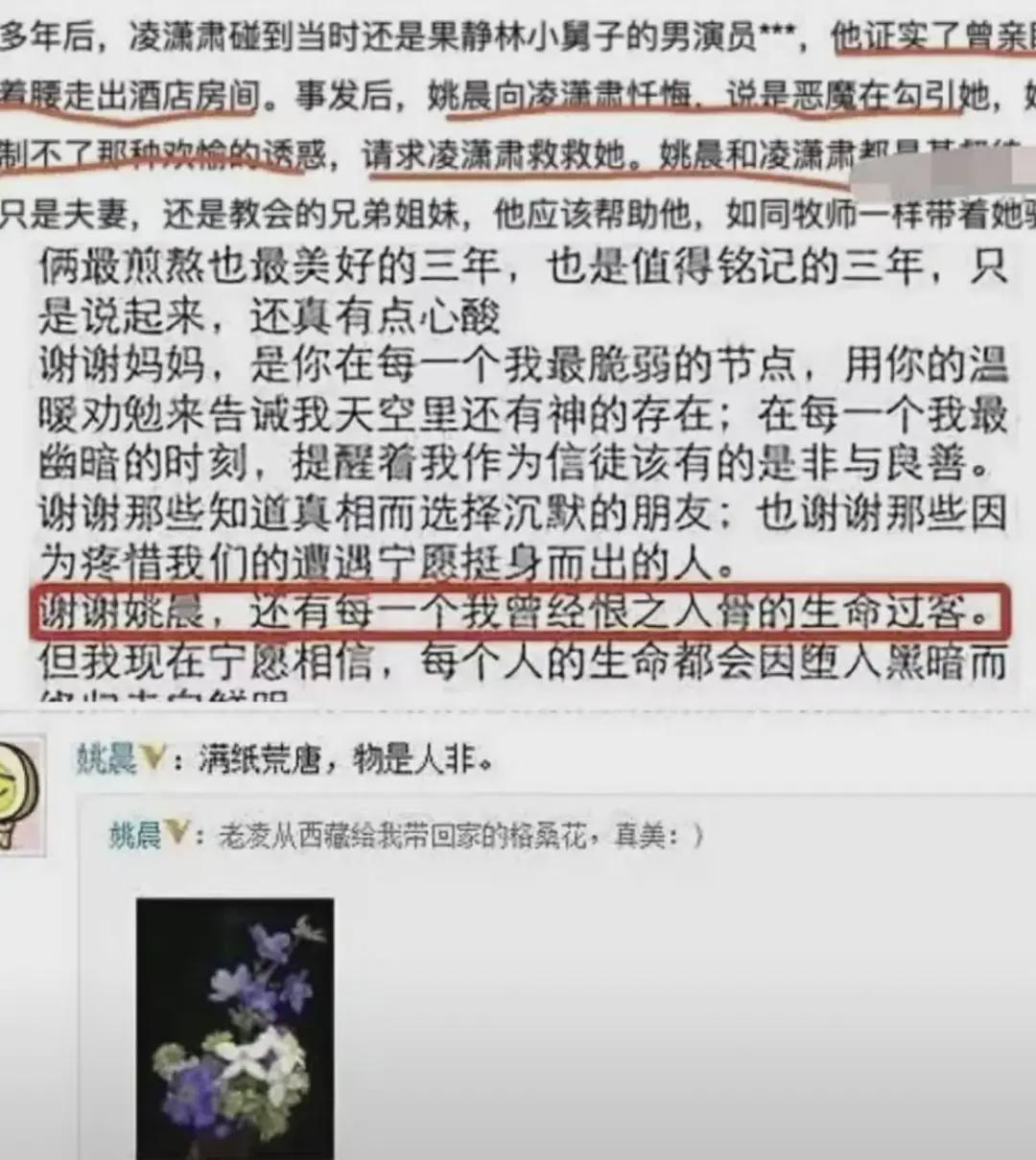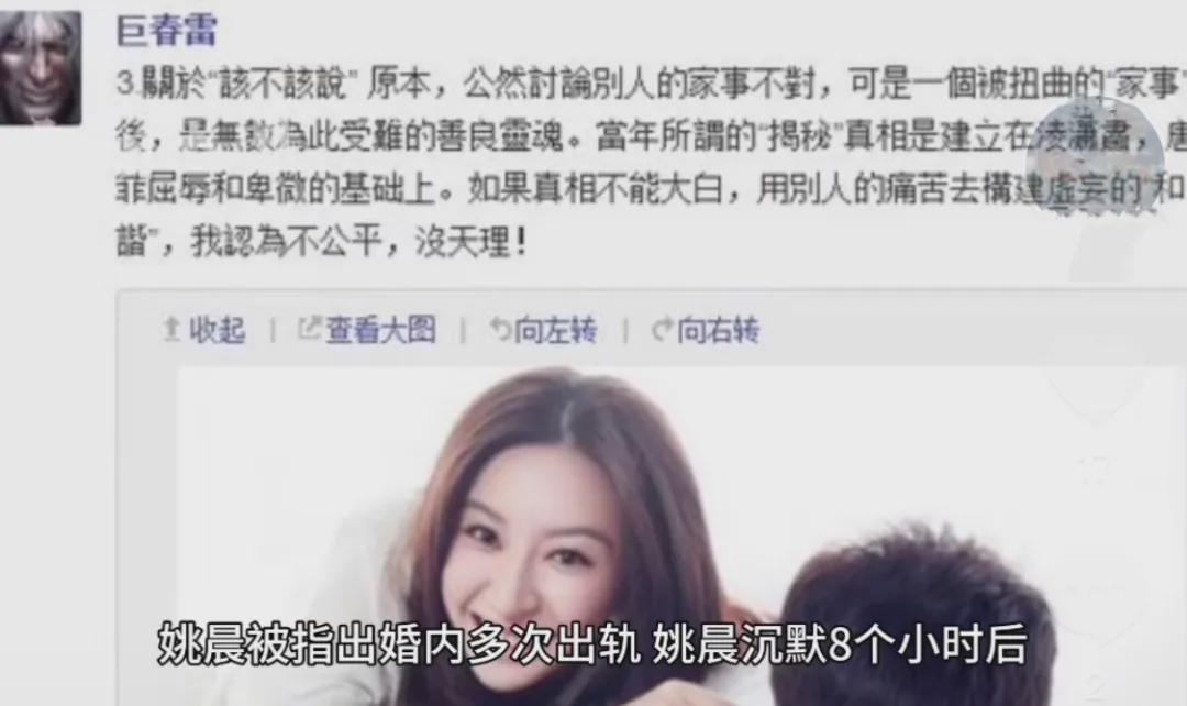 详细讲诉了姚凌离婚的始末,爆出姚晨才是婚内多次出轨的人,凌潇肃碍于面子,当时才没揭穿。