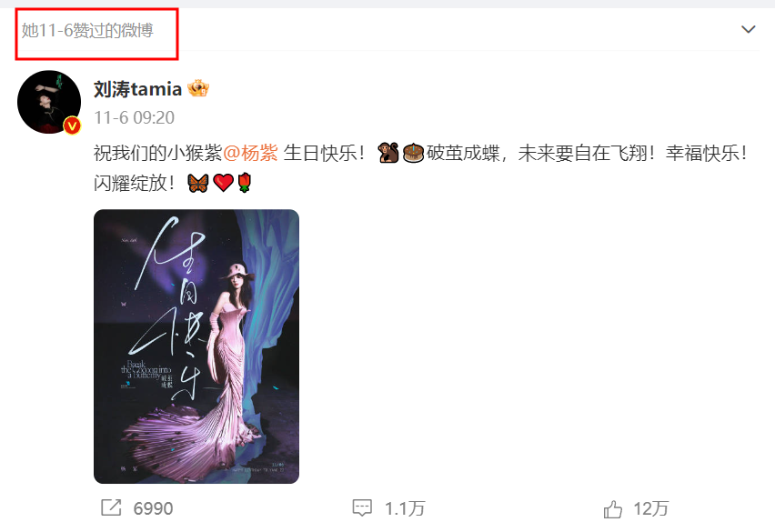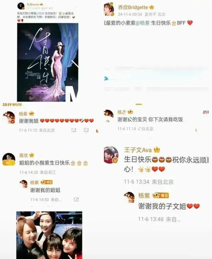 毫不意外的是,作为当红明星,当杨紫及其工作室发布生日动态,我们可以看到有很多明星发送了祝福,有刘涛、蒋欣、王子文、乔欣等人。在这一众人中,杨紫还点赞了刘涛送祝福的动态。