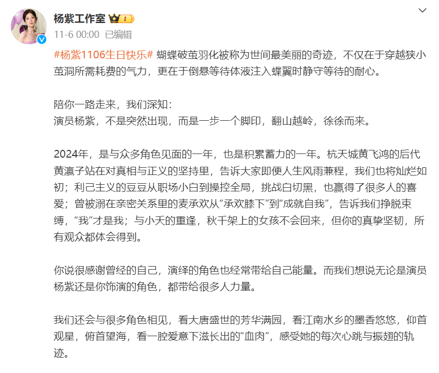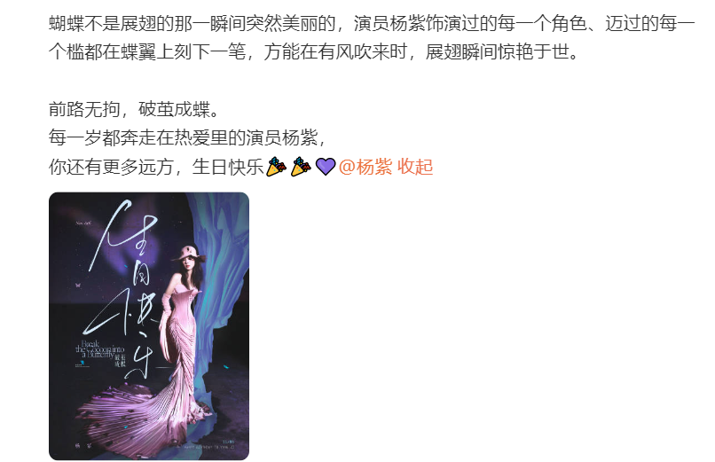 与此同时,杨紫工作室官方账号也为杨紫的生日造势,发布了一篇长文。