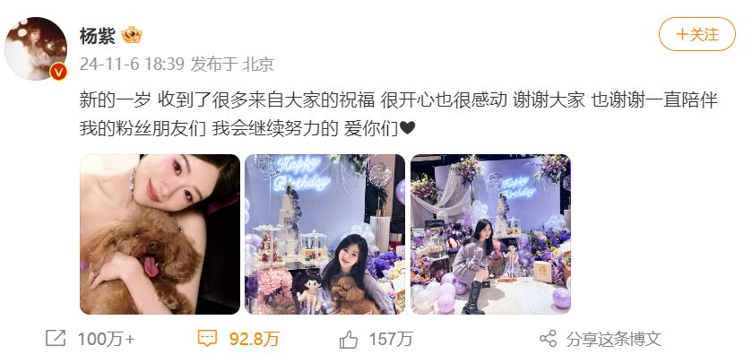 这一天,像往年一样,杨紫发布了几张最新照片,搭配了一条生日文案,在文案中她说她收到了大家的祝福,很开心很感动,她感谢大家的陪伴,将会继续努力。