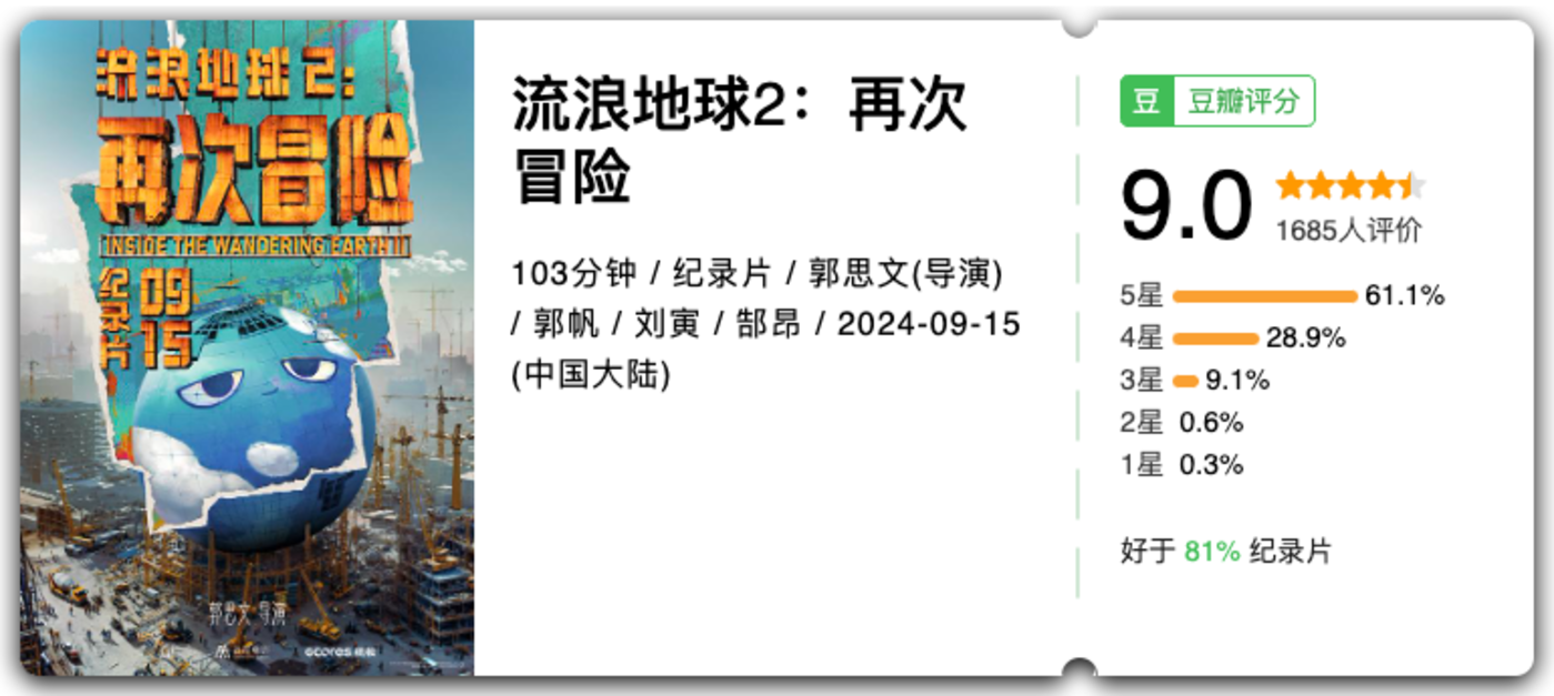 纪录片还以倒计时的形式,将电影500多天的制作幕后放置于百年的中国科幻发展脉络之中,让观众更直接地了解到影片的不易和一个类型的厚度,获得了豆瓣开分9.0的好成绩。