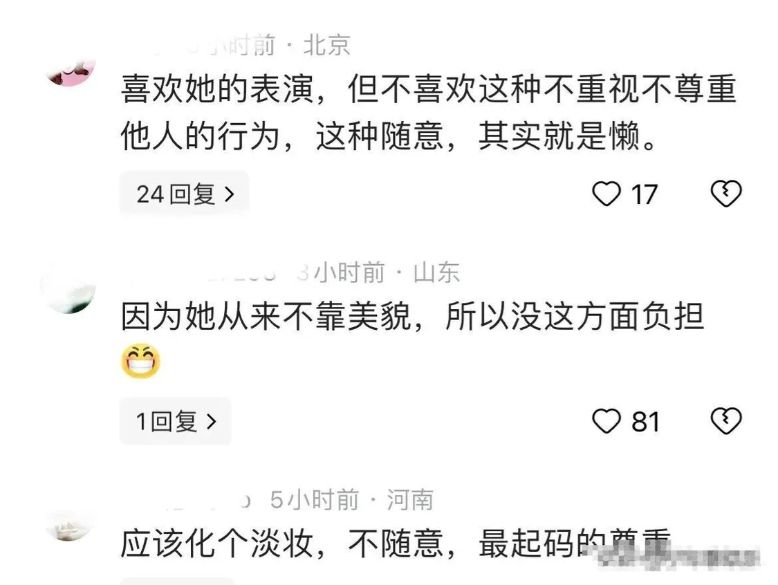 然而,不少网友却对吴越这样的行为表示反感,甚至嗤之以鼻,直言:喜欢她的表演,但这种行为是不重视和不尊重他人的行为,这种随意,其实就是懒。
