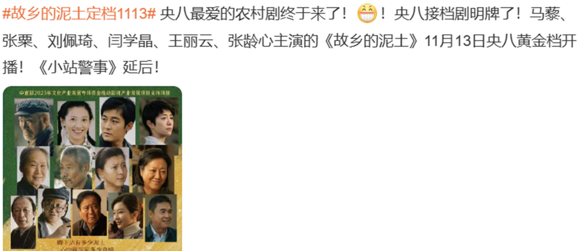又一新年代剧《故乡的泥土》来袭,将于11月13号在央视八套播出,也就是今晚央视开播,此消息一出,可把不少观众激动坏了,纷纷表示又可以熬夜追剧了,再加上全员实力派,网友:年代剧又要出爆款了,值得一看。