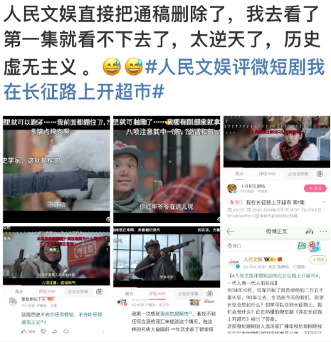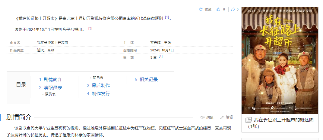 《我在长征路上开超市》这部短剧一共5集,每一集都是长征路上的真实故事改编,剧本来源于自知乎盐言故事二彻劈山原著《苏梅梅的超市》。