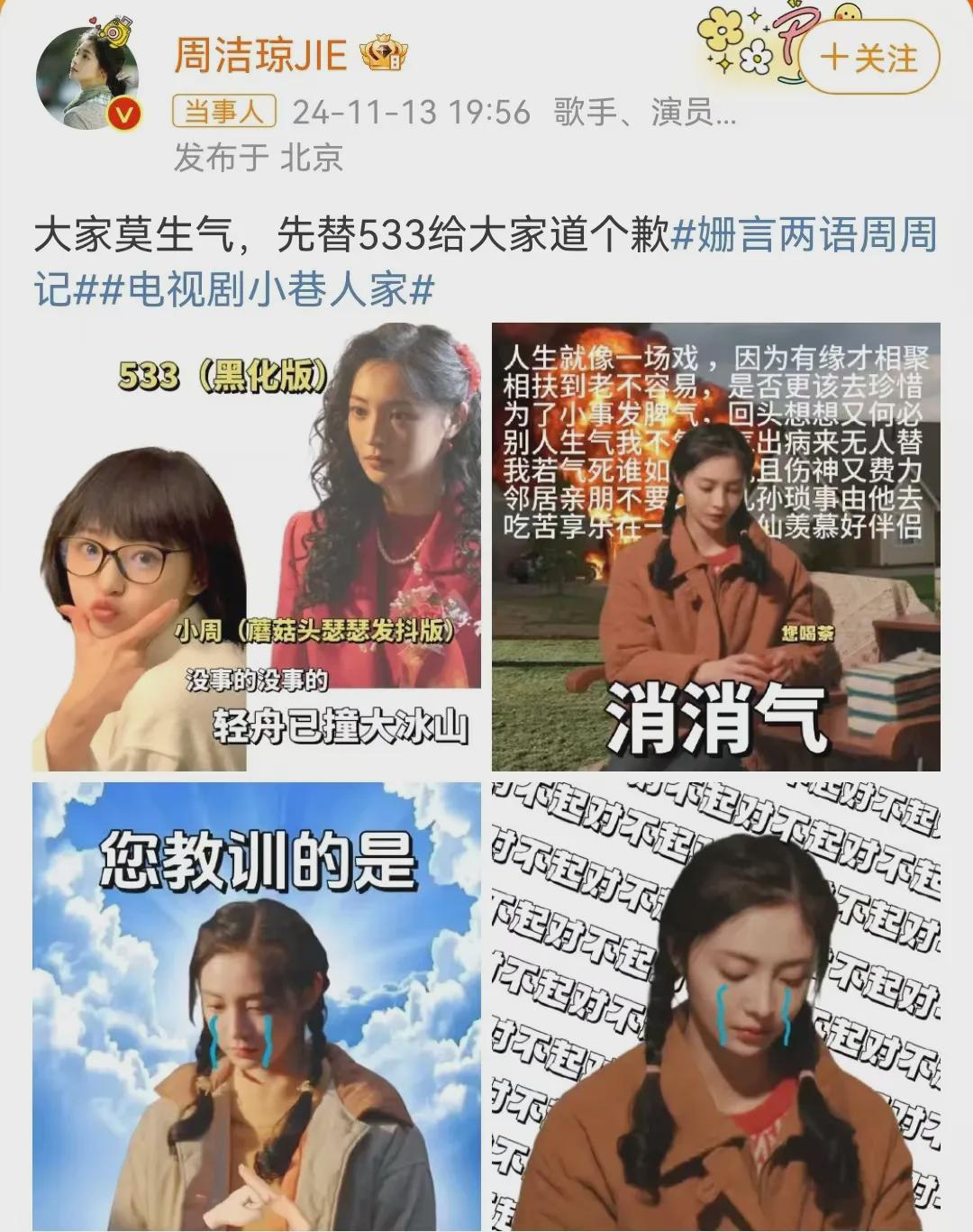 知道“吴姗姗是白眼狼”上了热搜,周洁琼连忙发文,替吴珊珊给观众们道歉,还发了几个让大家消消气的表情包。
