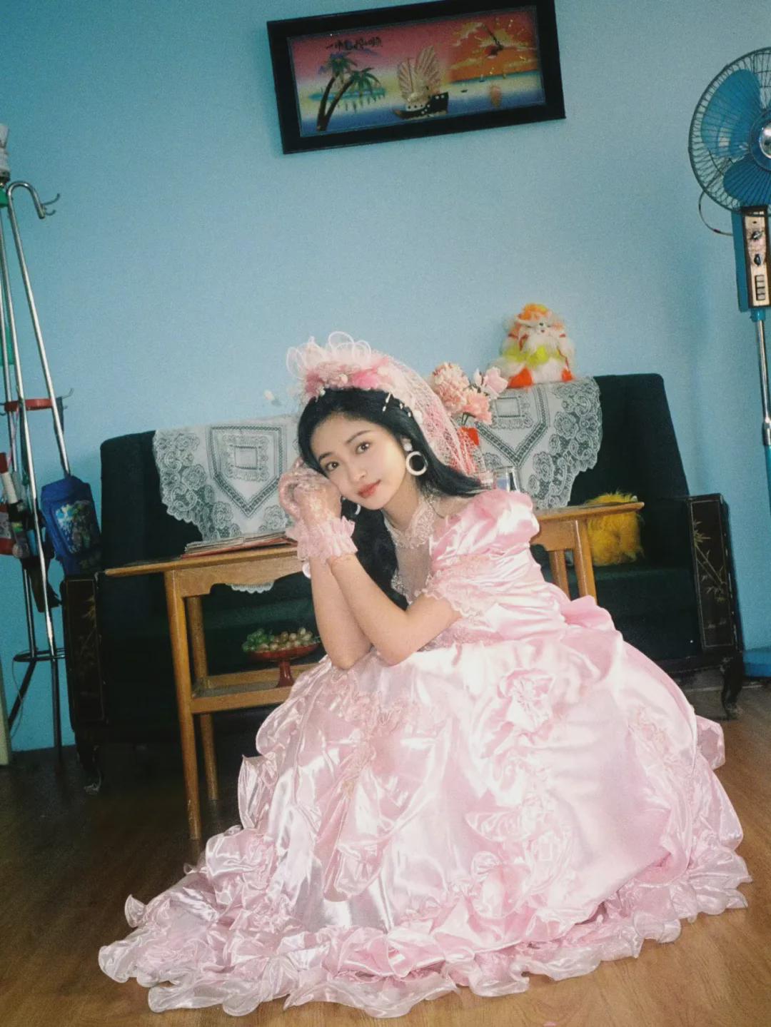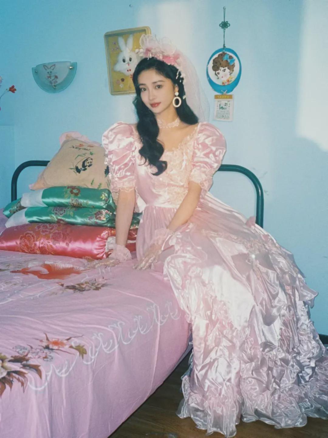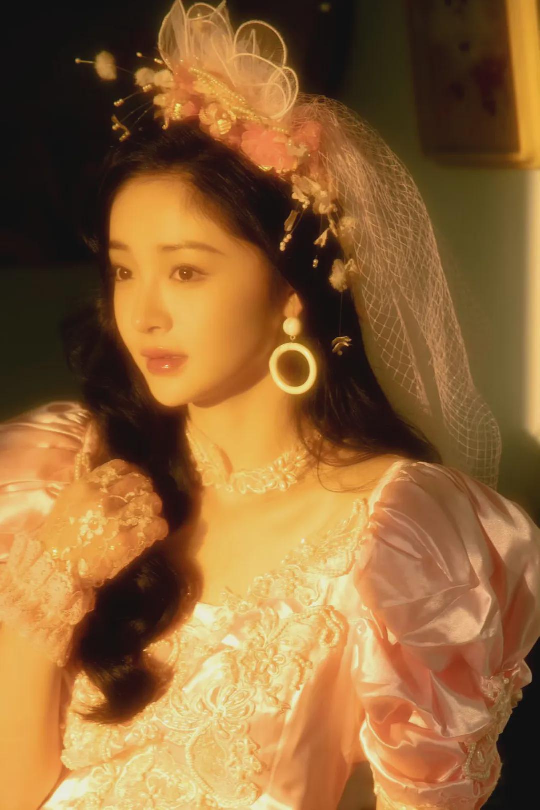 周洁琼穿的是一件粉色的婚纱,粉色头纱和头饰,再配上大耳环,同色系手套和大波浪卷发,一个80年代的漂亮新娘,就这么水灵灵地站在网友面前,谁看了不心动,经历过80年代的中年网友,有没有想起自己结婚的时候?
